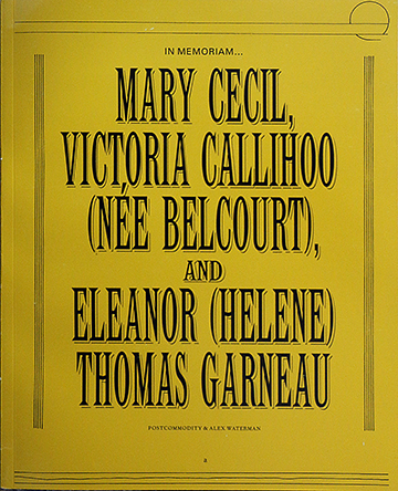 In Memoriam . . . Mary Cecil, Victoria Callihoo (Née Belcourt), and Eleanor (Helene) Thomas Garneau by Postcommodity and Alex Waterman. Compositions performed and recorded at Banff Centre for Arts and Creativity, Banff, Alberta, and the Windspear Centre for Music in Edmonton, Alberta.