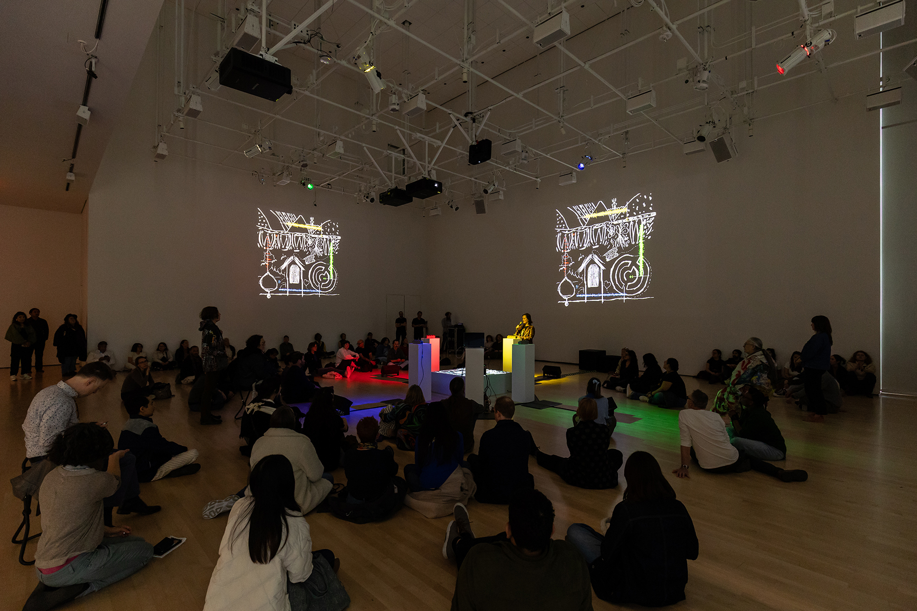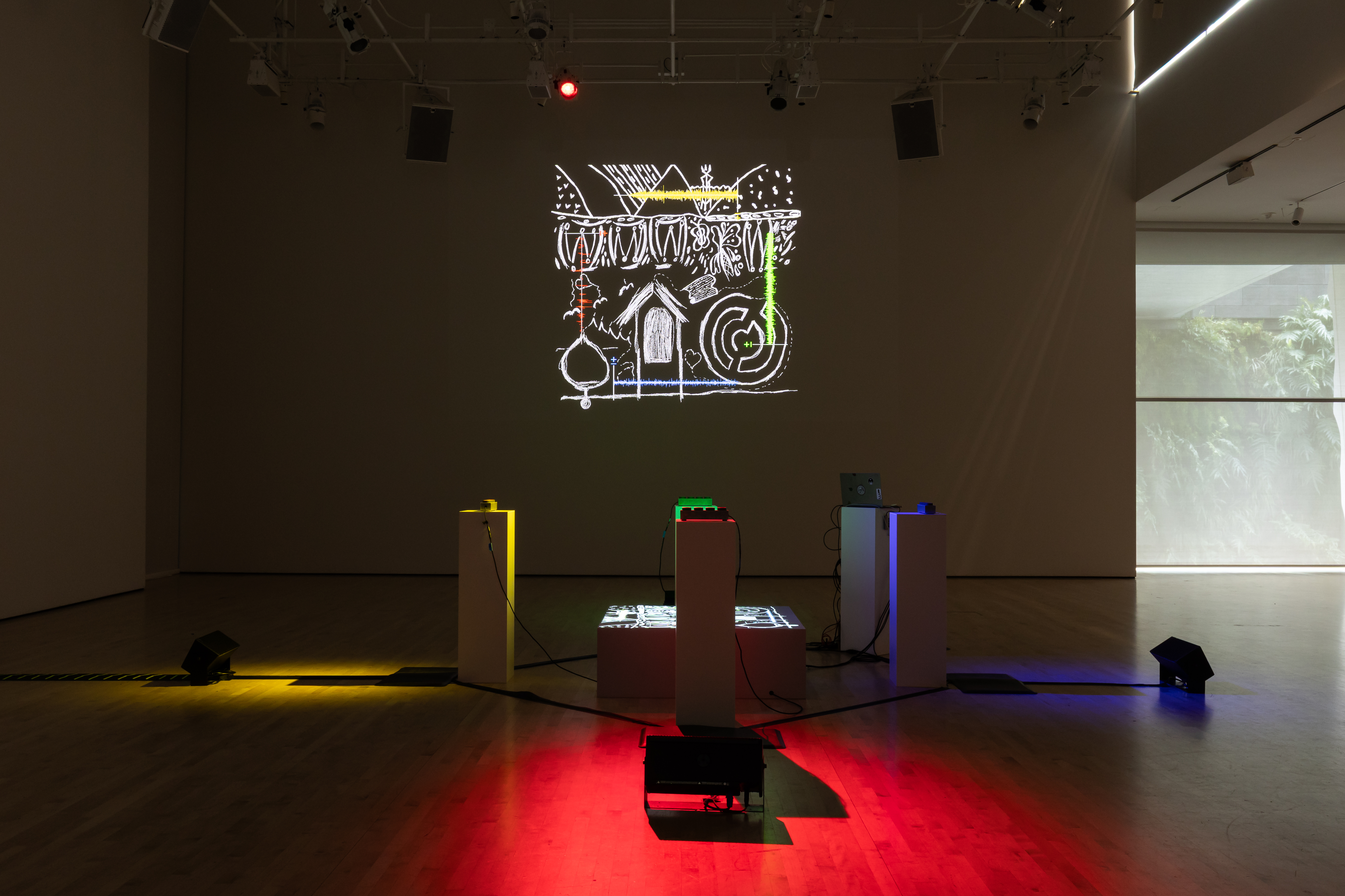 Using Cosmovisión, Postcommodity foregrounds the element of sound to learn about people's relationships to the land they come from and occupy today. For their installation at SFMOMA, titled Cosmovisión Torneo de la Bahia, Postcommodity invited seven Bay Area-based arts and cultural workers to participate in the premiere of Cosmovisión, a musical event and sonic ceremony currently unfolding in this space. These workers were selected because they serve the Bay Area by helping to organize community. Considering the greater acoustic ecology at work in both built and natural environments, each participant sonically mapped the local landscape with field recordings. Their sounds embody a spectrum of frequencies that represent places with personal significance, whether connected to memory from the past or even a proposition for the future. Stories emerging through this collaboration are sonified and visualized as graphic musical scores projected on the walls and floor.