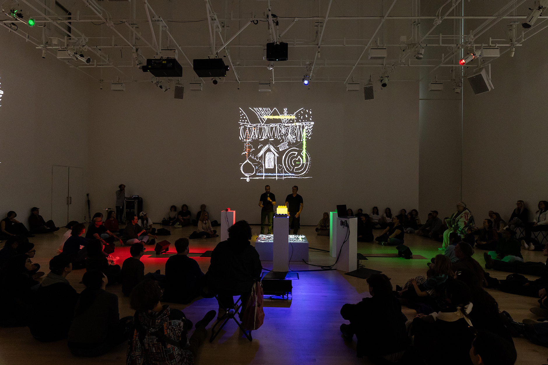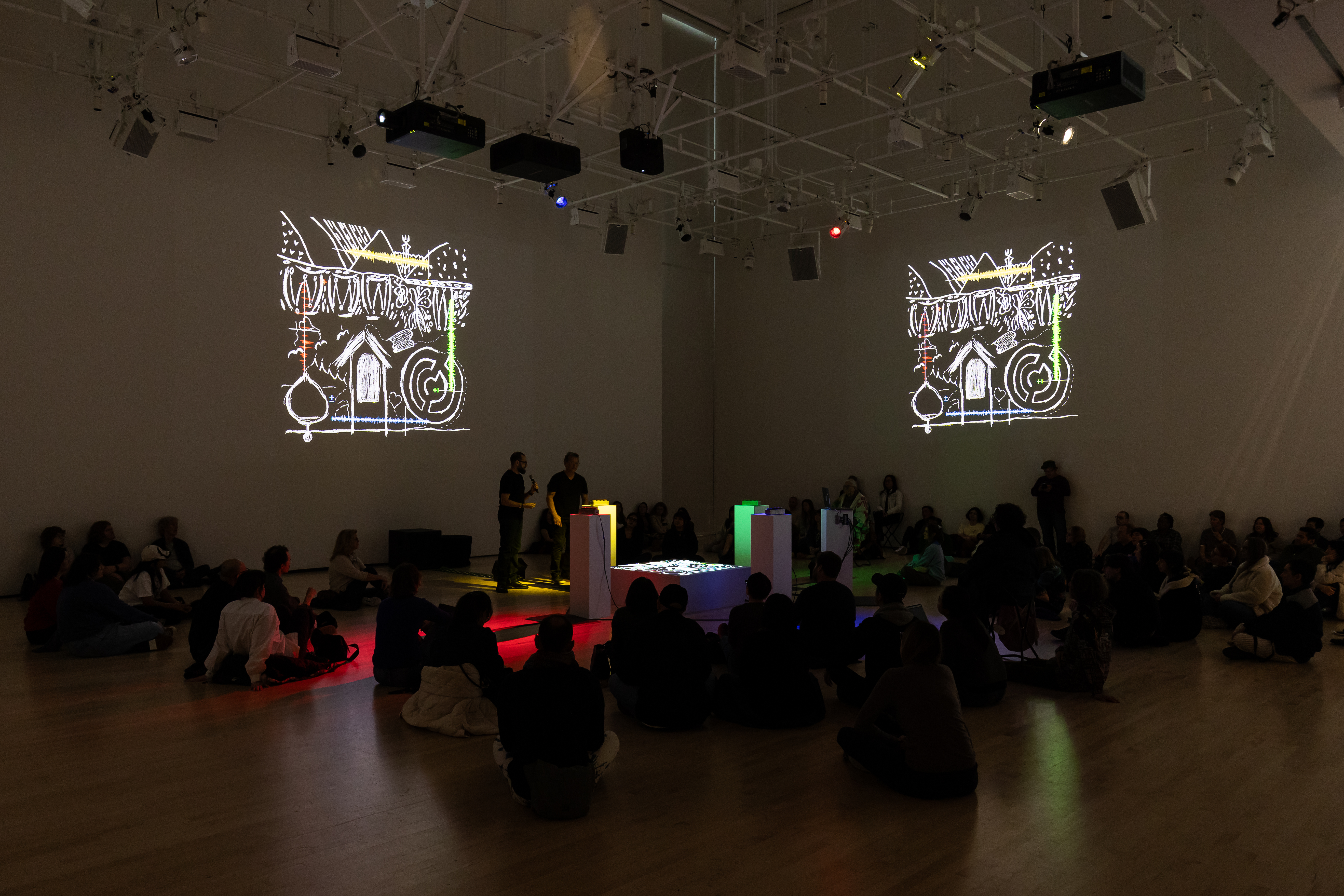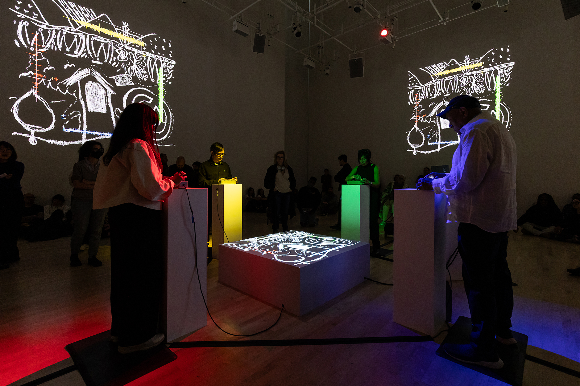 Two teams of participants take turns performing the instrument of Postcommodity's invention to transform their recordings into experimental music and use the device's controls to send real-time feedback to one another. Line drawings that form the scores come into view when participants collaboratively improvise and harmonize sounds. The projected images will dissipate into smoke with discordance but return to focus with sonority. Using land as a mediator of relationships in this work, the collective encourages knowledge sharing, the practice of listening, and the creation of generative conversations that can lead to syncretized worldviews.