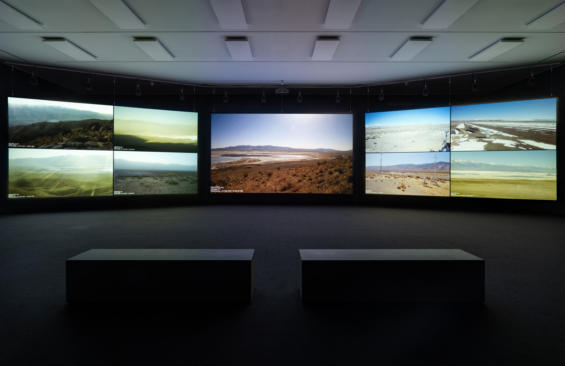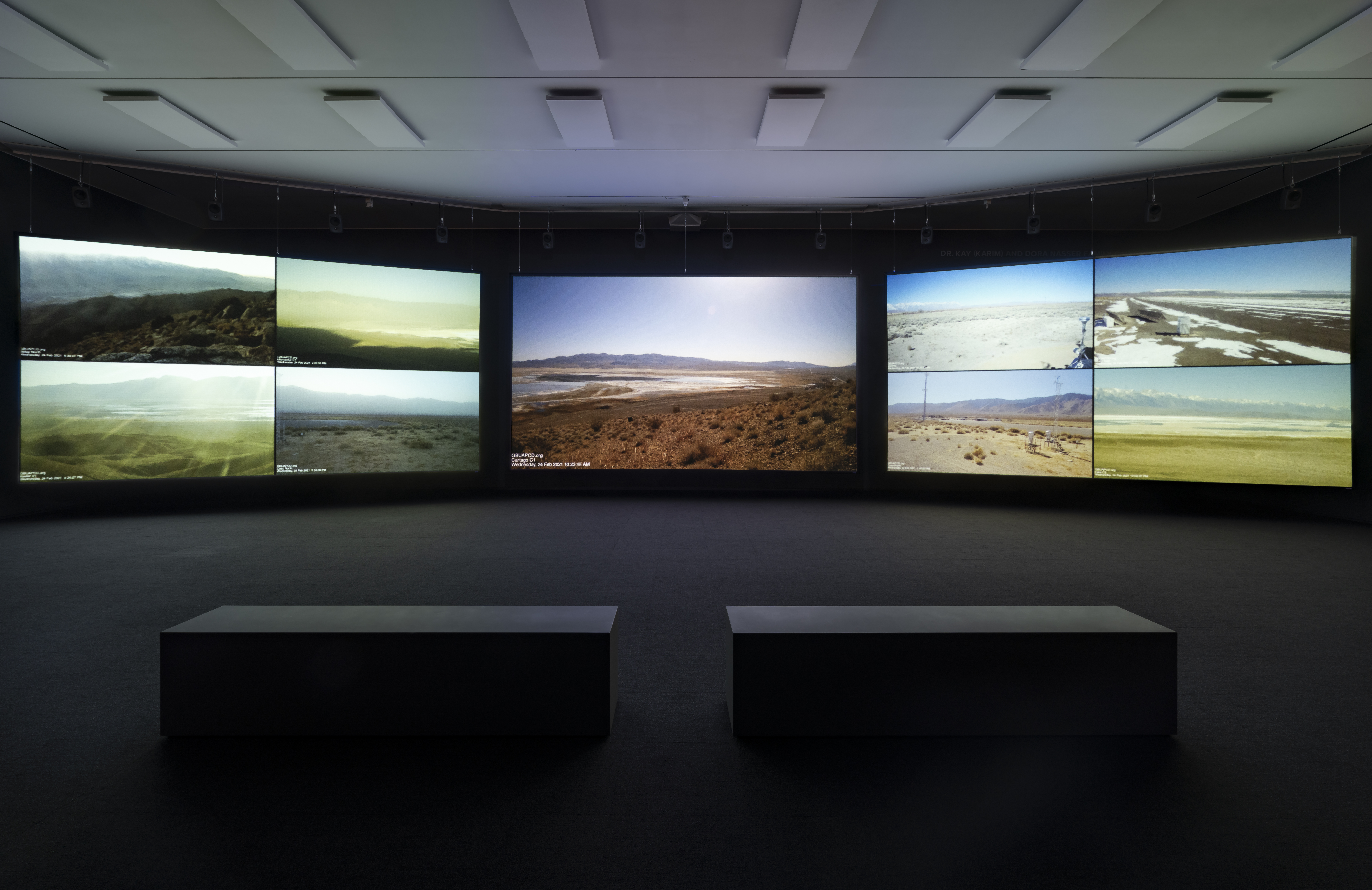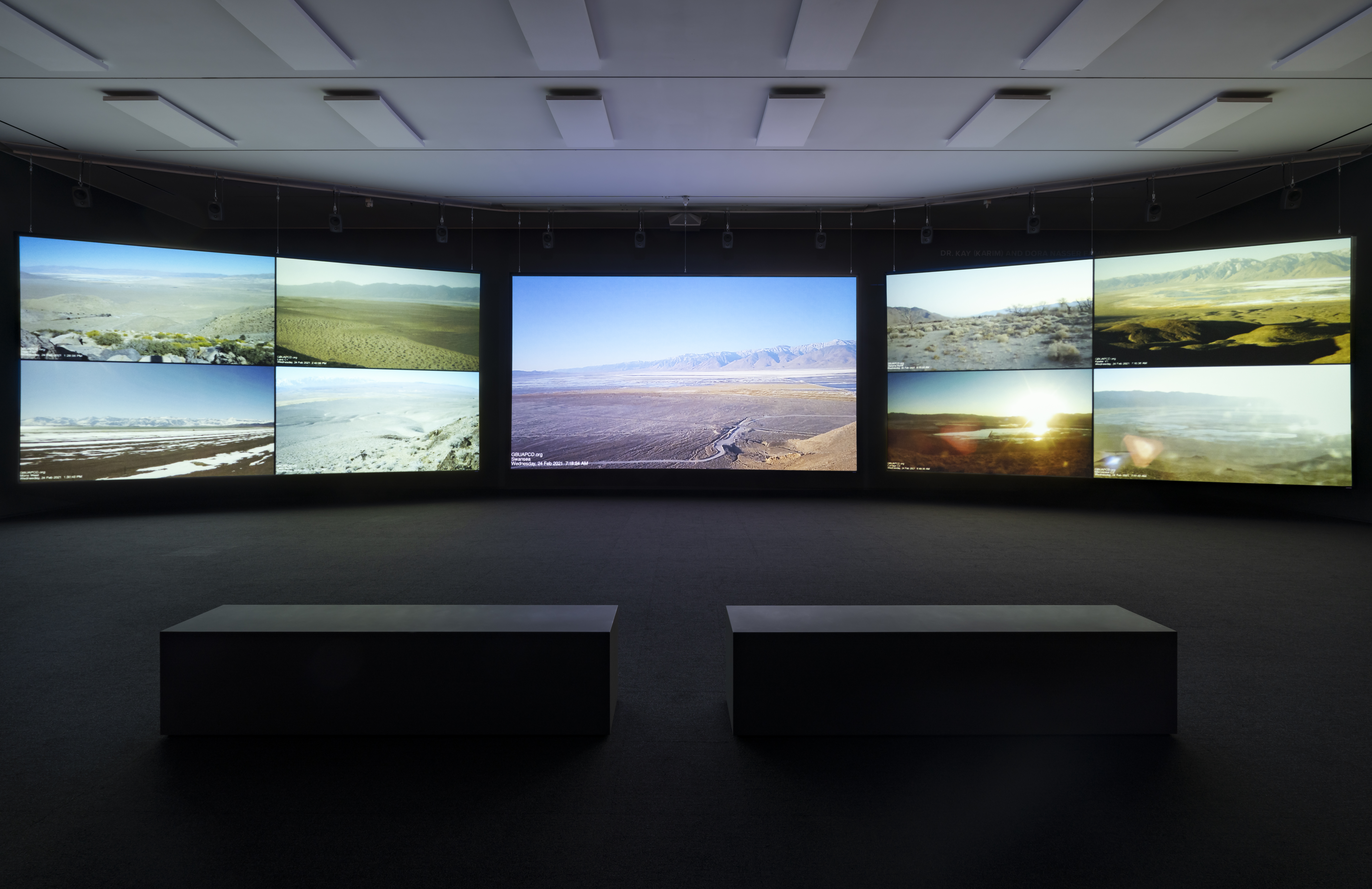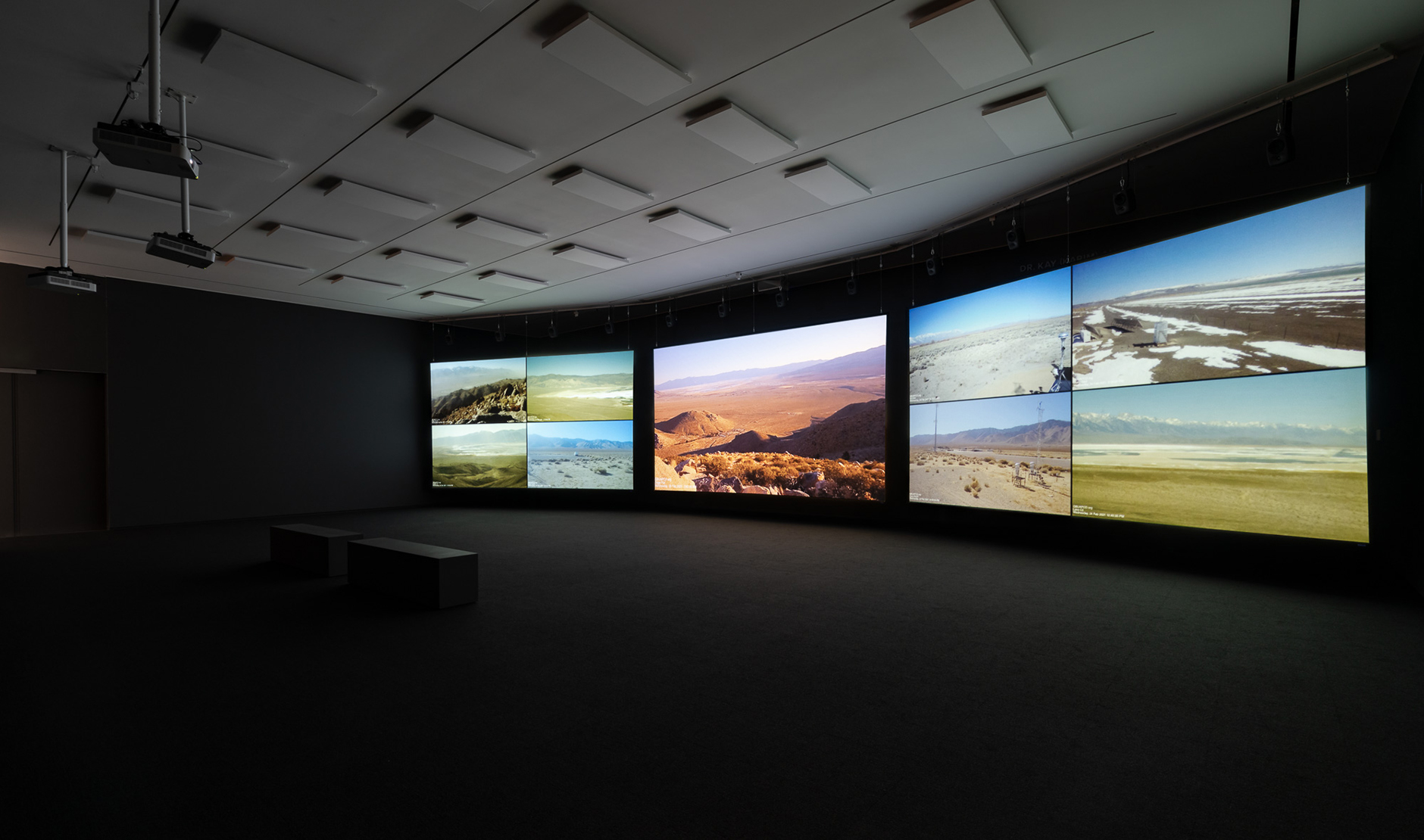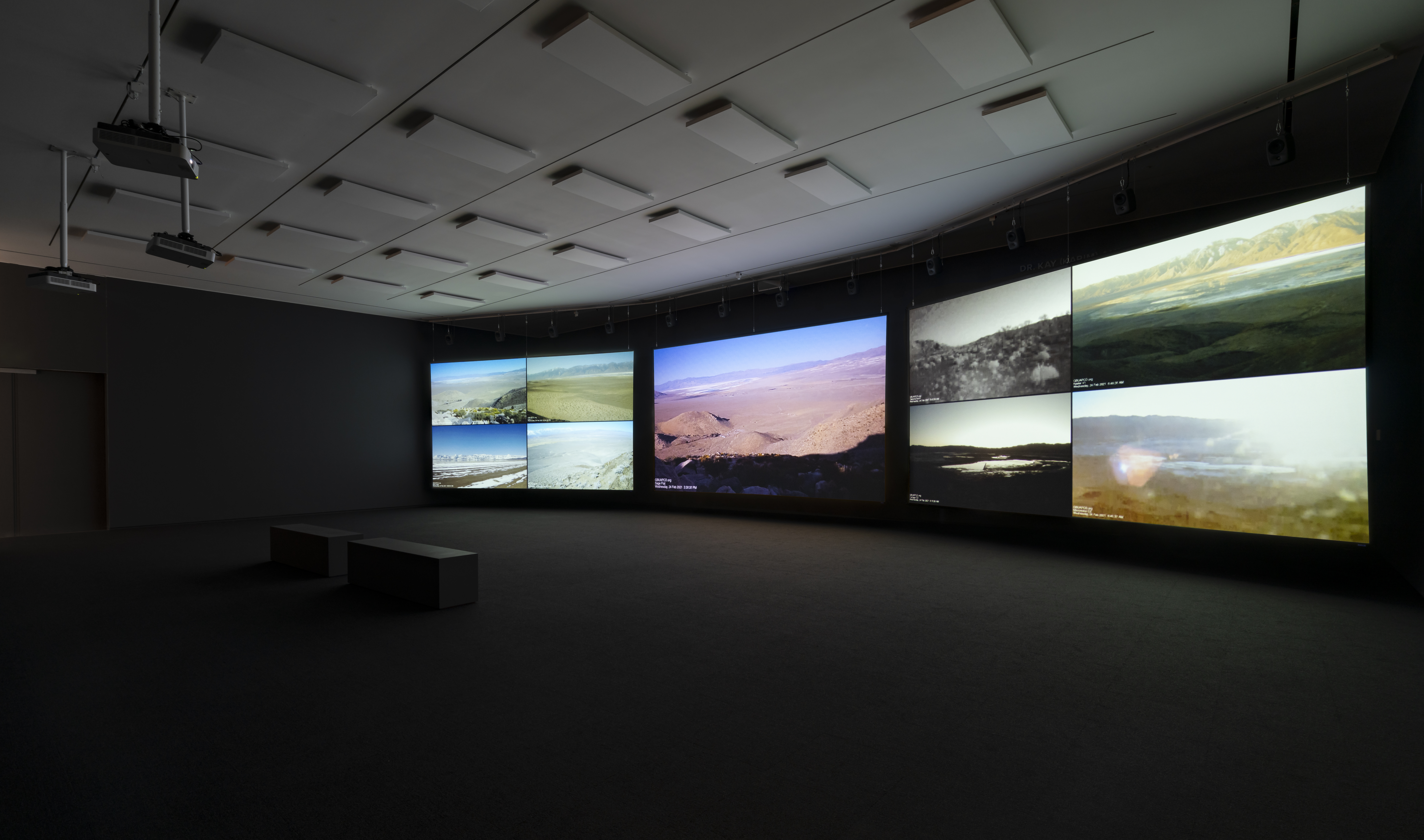 As environmental policy-in-action, a government agency currently operates 22 cameras throughout the valley to monitor the environmental conditions. For Going to Water, Postcommodity gathered footage from the online archive of these recordings. Projected onto three large screens, with an expansive and haunting soundtrack, the work creates a tension between the scenic beauty of the valley and the horror of ecological disaster.